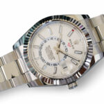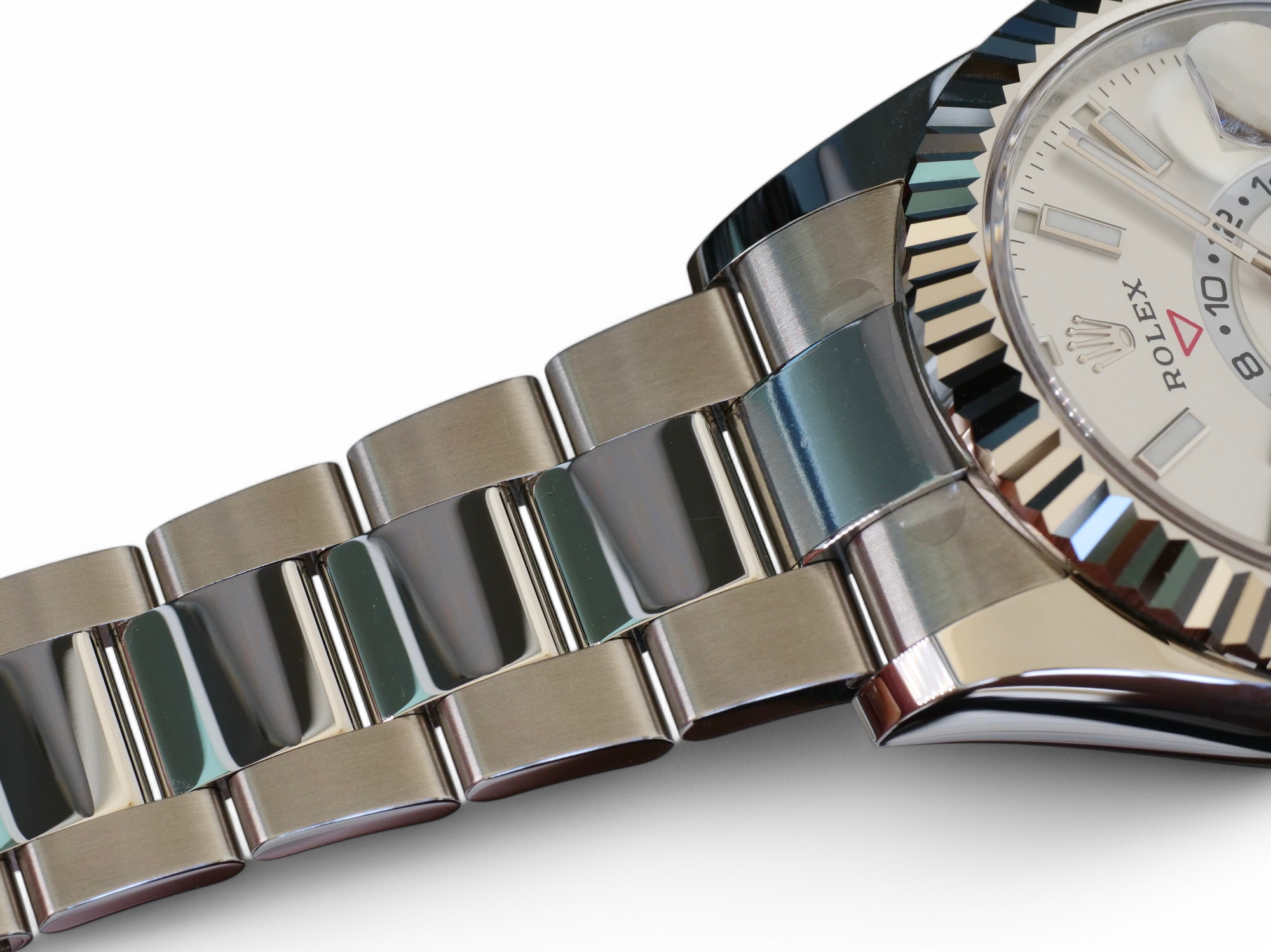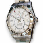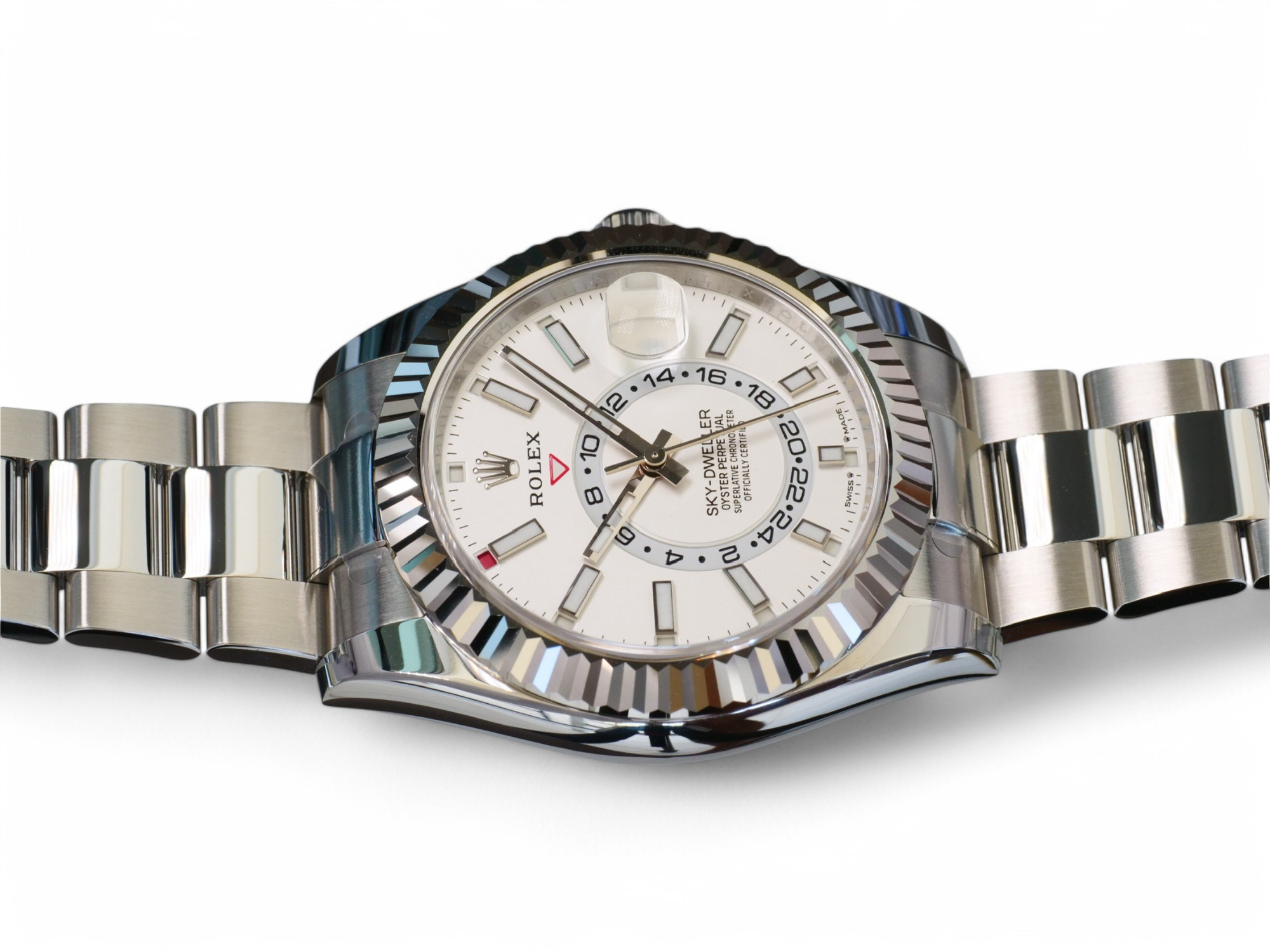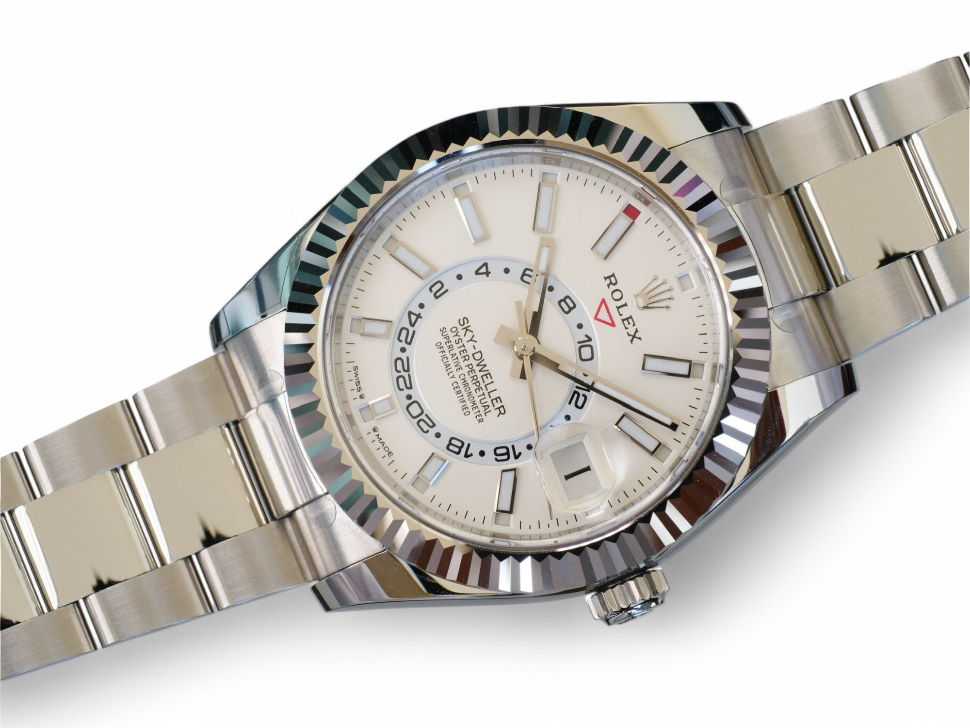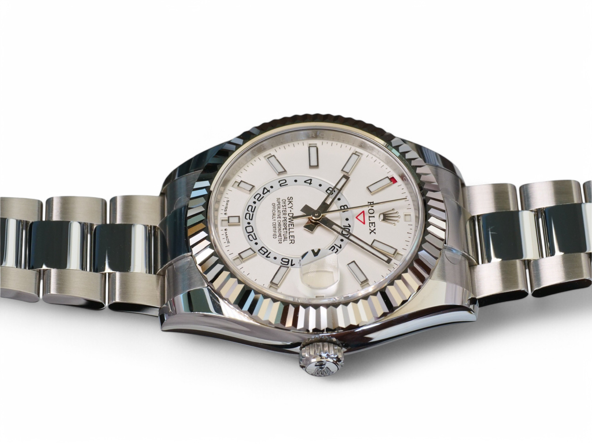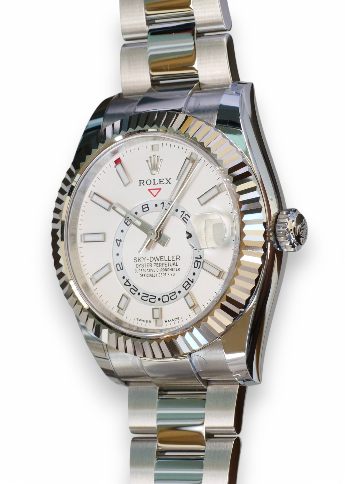 Rolex Sky-dweller White Dial, 336934, Oystersteel bracelet, a very beautiful and technically, the highest complication Rolex watch to exist with an annual calendar, dual time and date complication, all offered while featuring the iconic and timeless Rolex looks in an Oyster Perpetual model.
