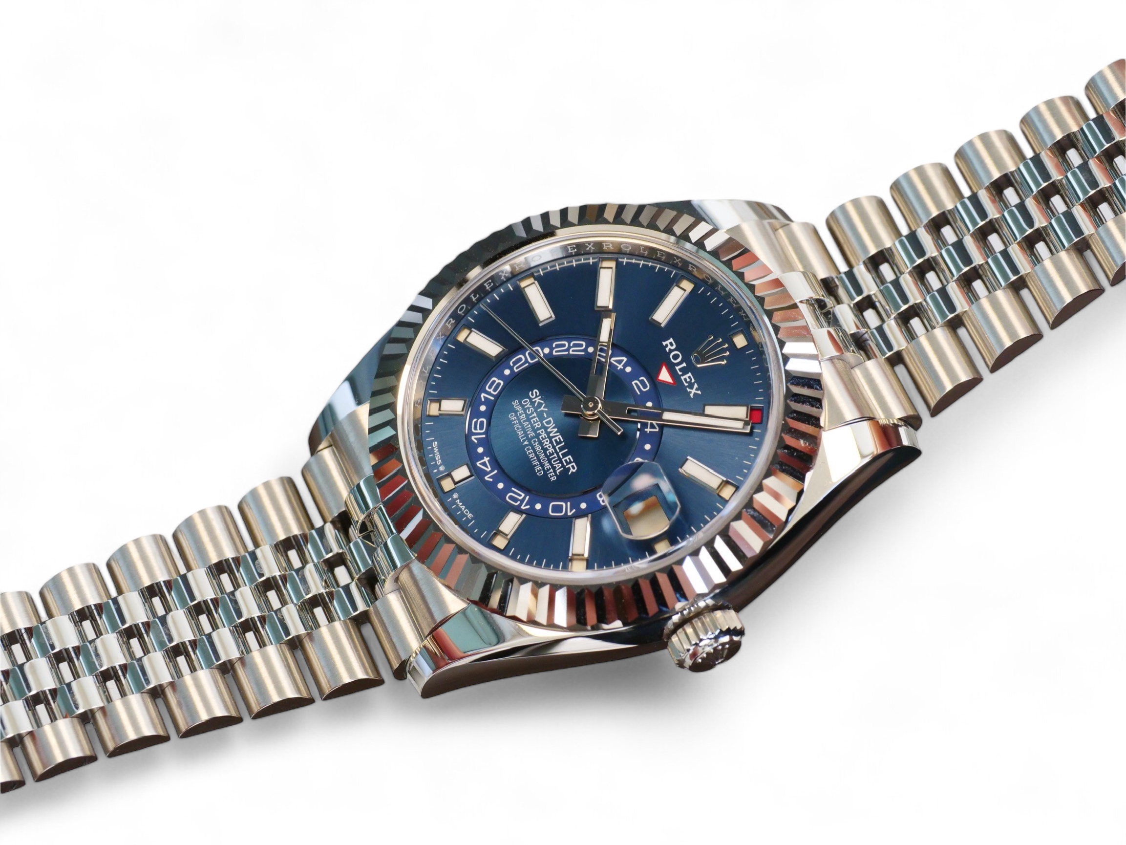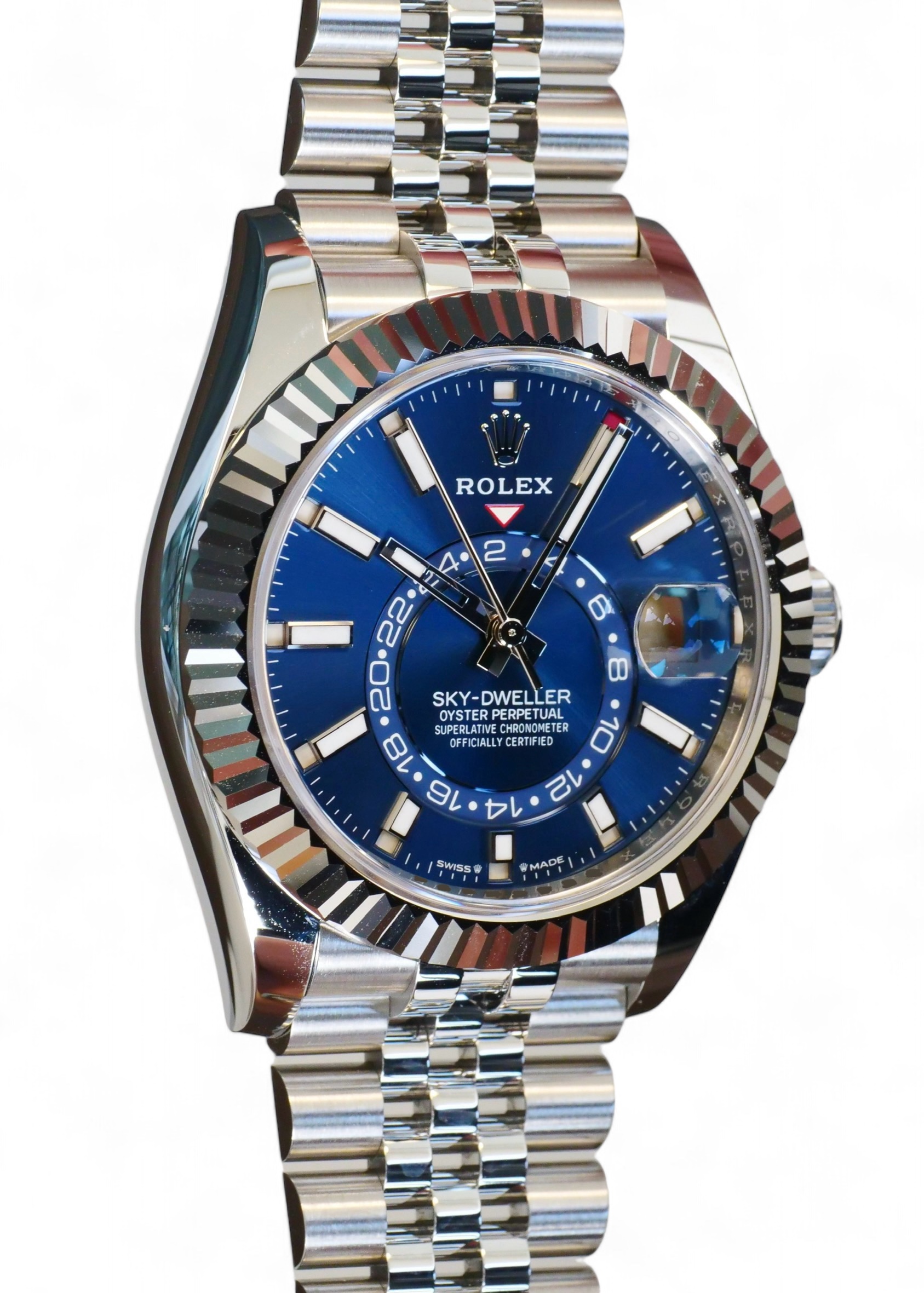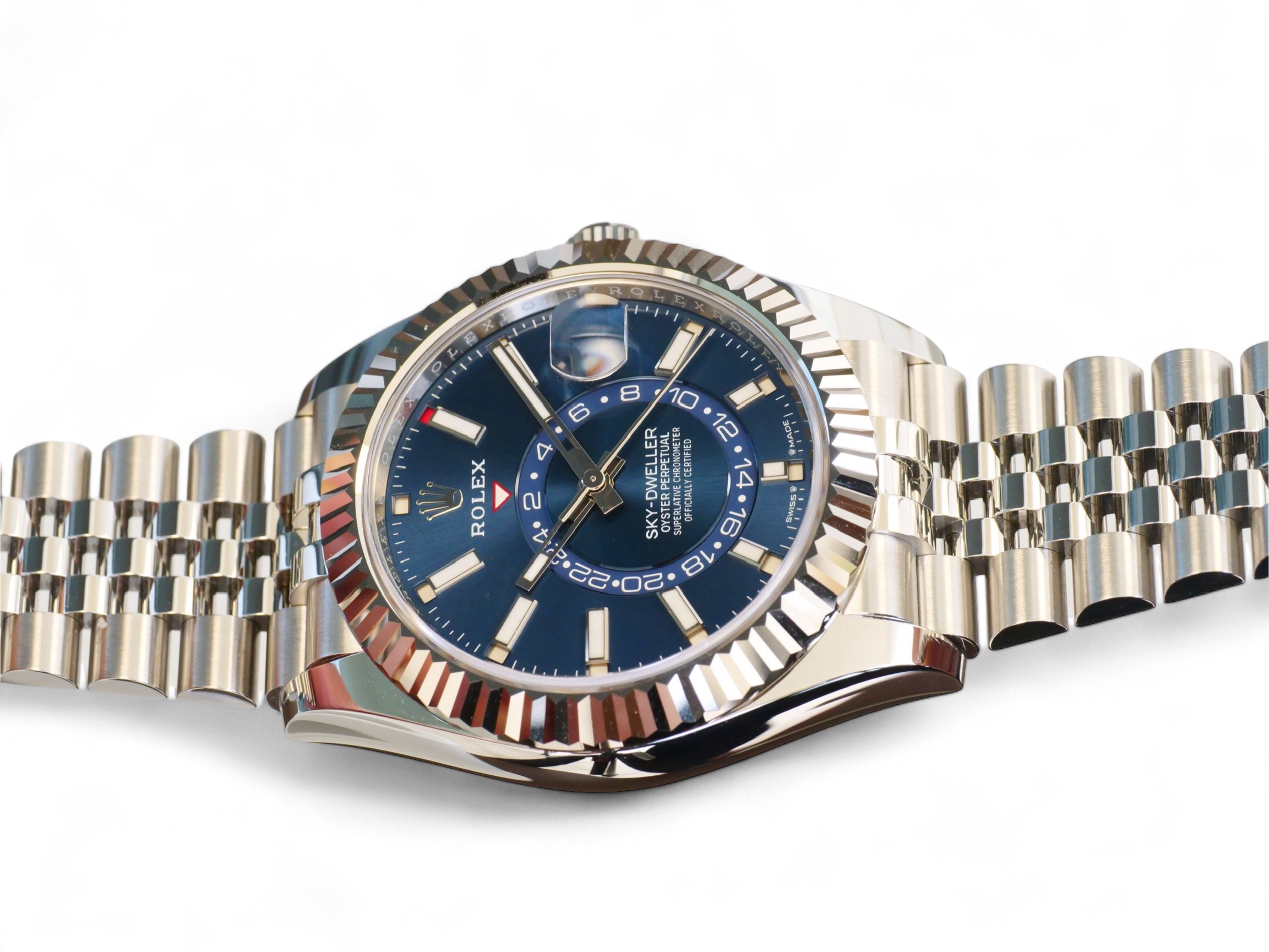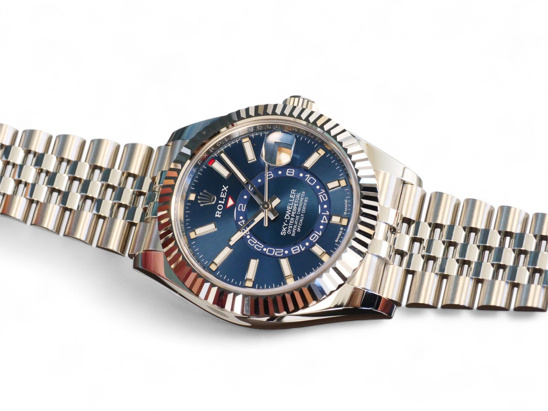 Featuring one of the most desirable and technically, the most complicated Rolex watch to exist, the Sky-dweller with an annual calendar, dual time and date complication in a spectacular sunburst blue dial and the most desired configuration of Jubilee bracelet.