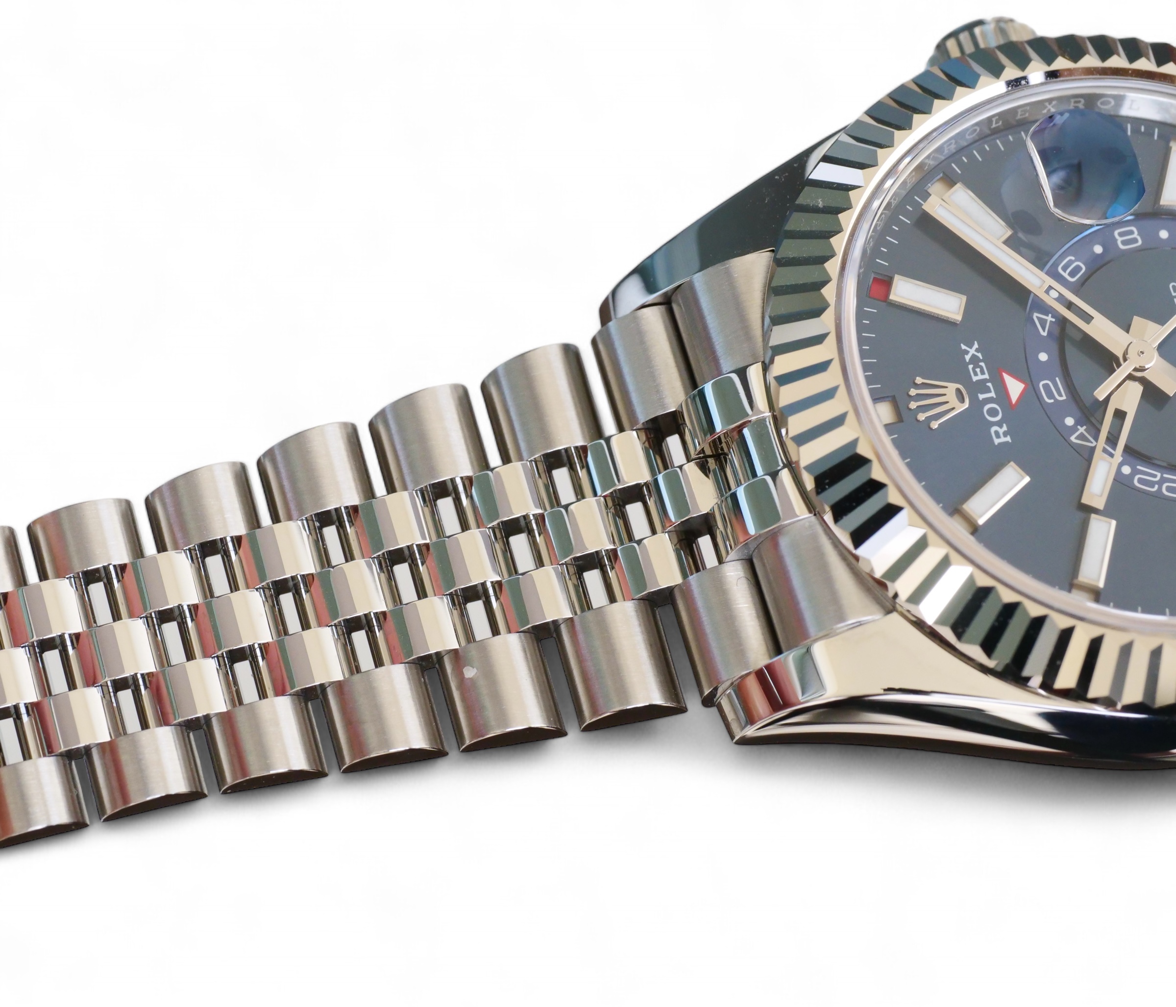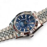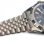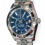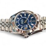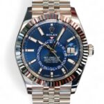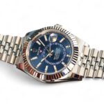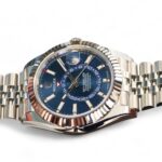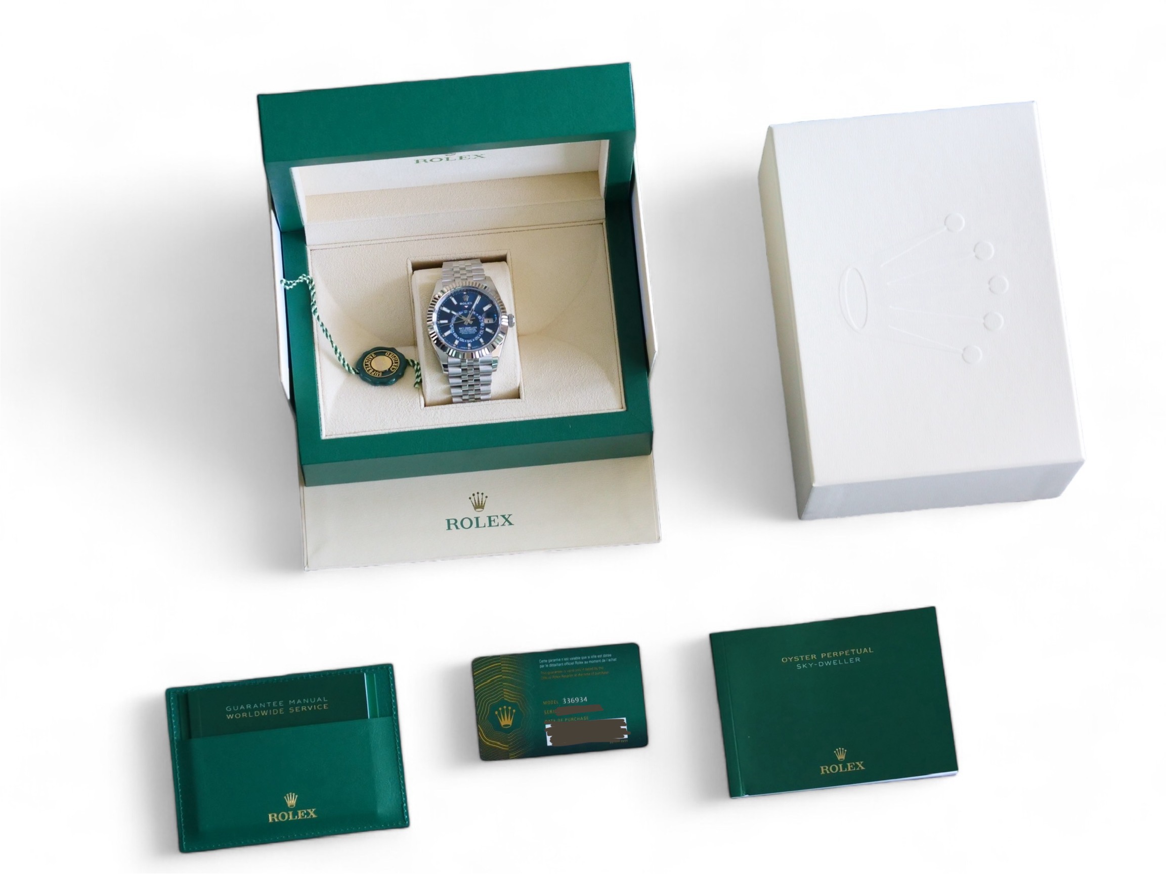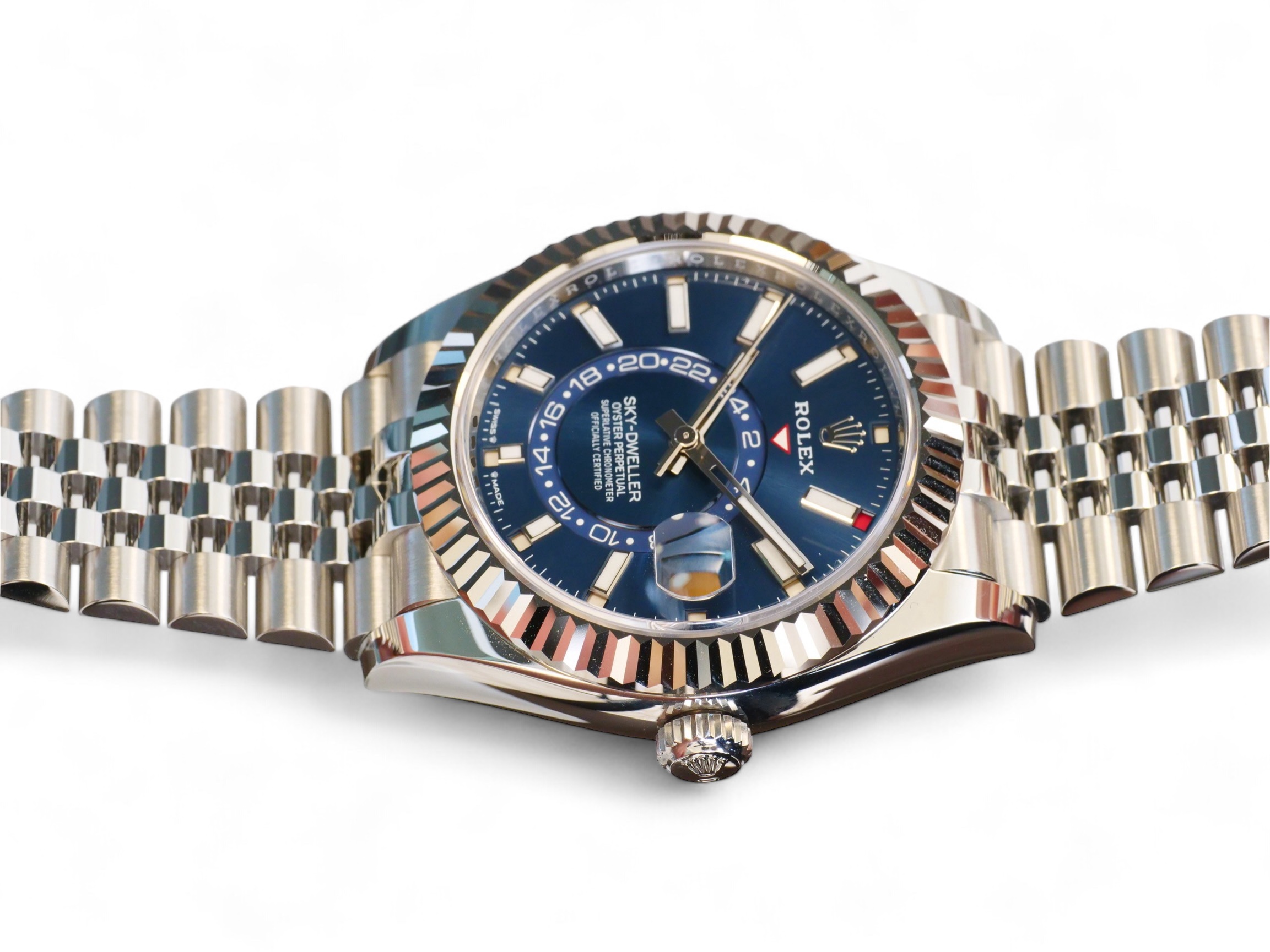 Featuring one of the most desirable and technically, the most complicated Rolex watch to exist, the Sky-dweller with an annual calendar, dual time and date complication in a spectacular sunburst blue dial and the most desired configuration of Jubilee bracelet.