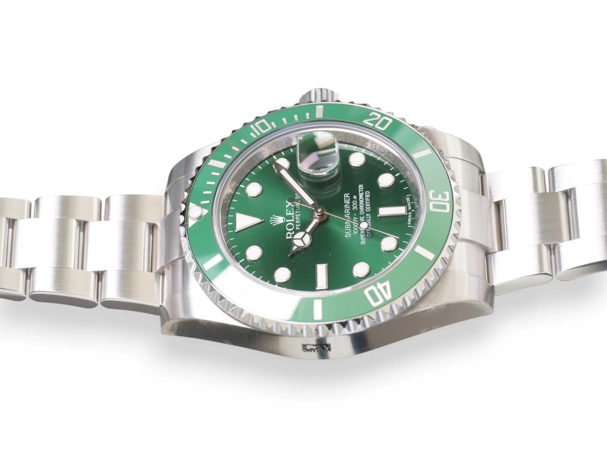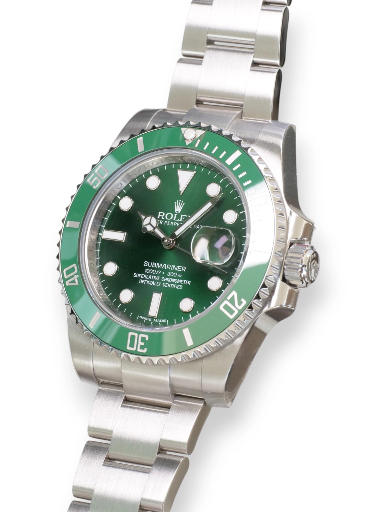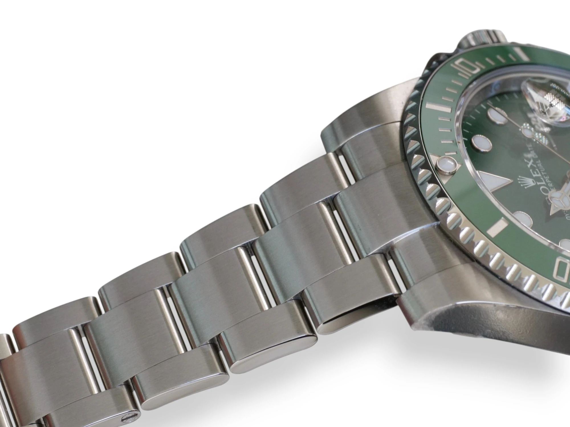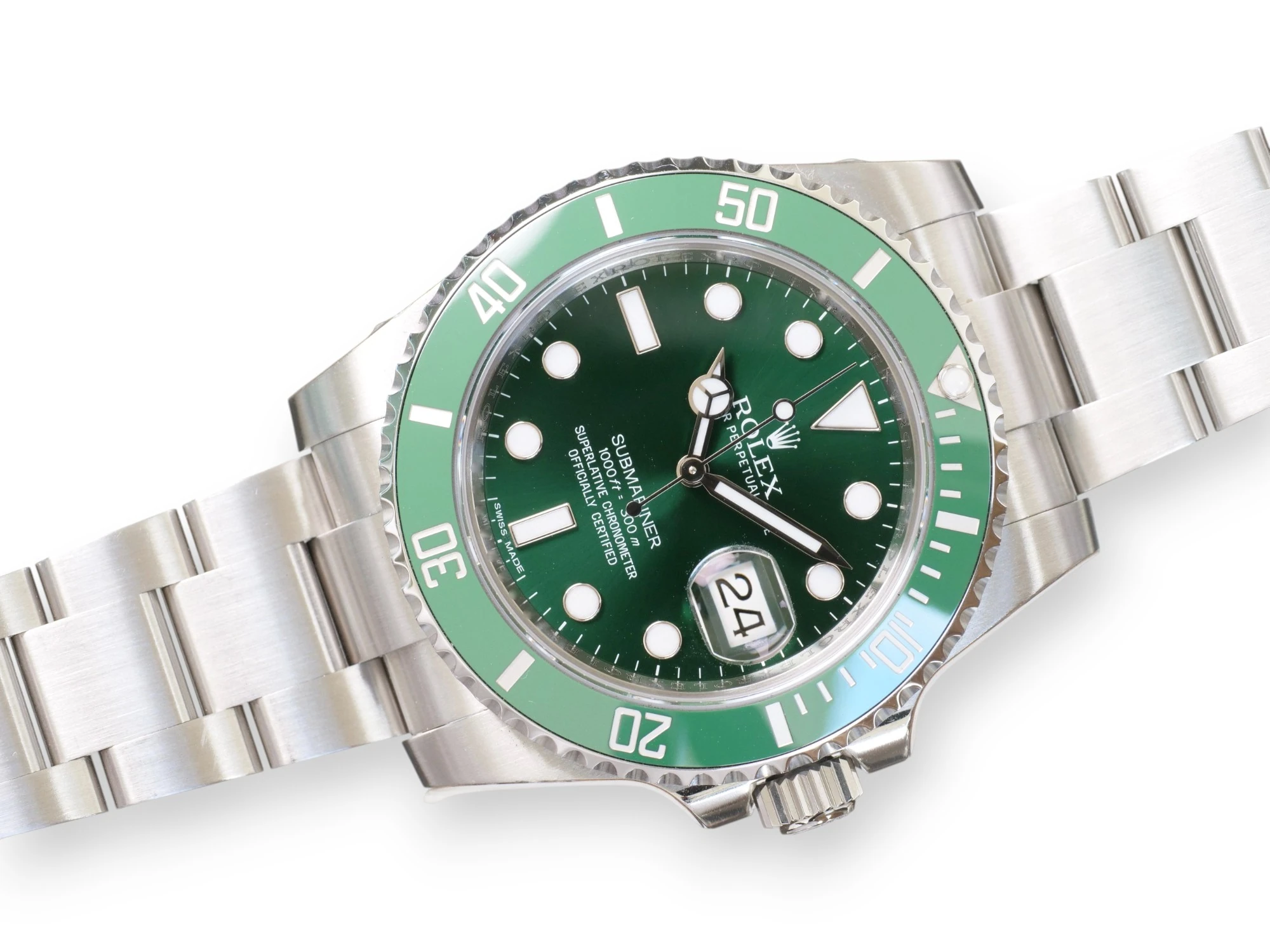 Rolex Submariner Date Hulk model 116610LV, a beautiful, long discontinued and a very collectible Rolex in a spectacular green sunburst dial, and green ceramic bezel – the only all-stainless-steel Submariner in a colored, and then a green dial ever produced in over seven decades.