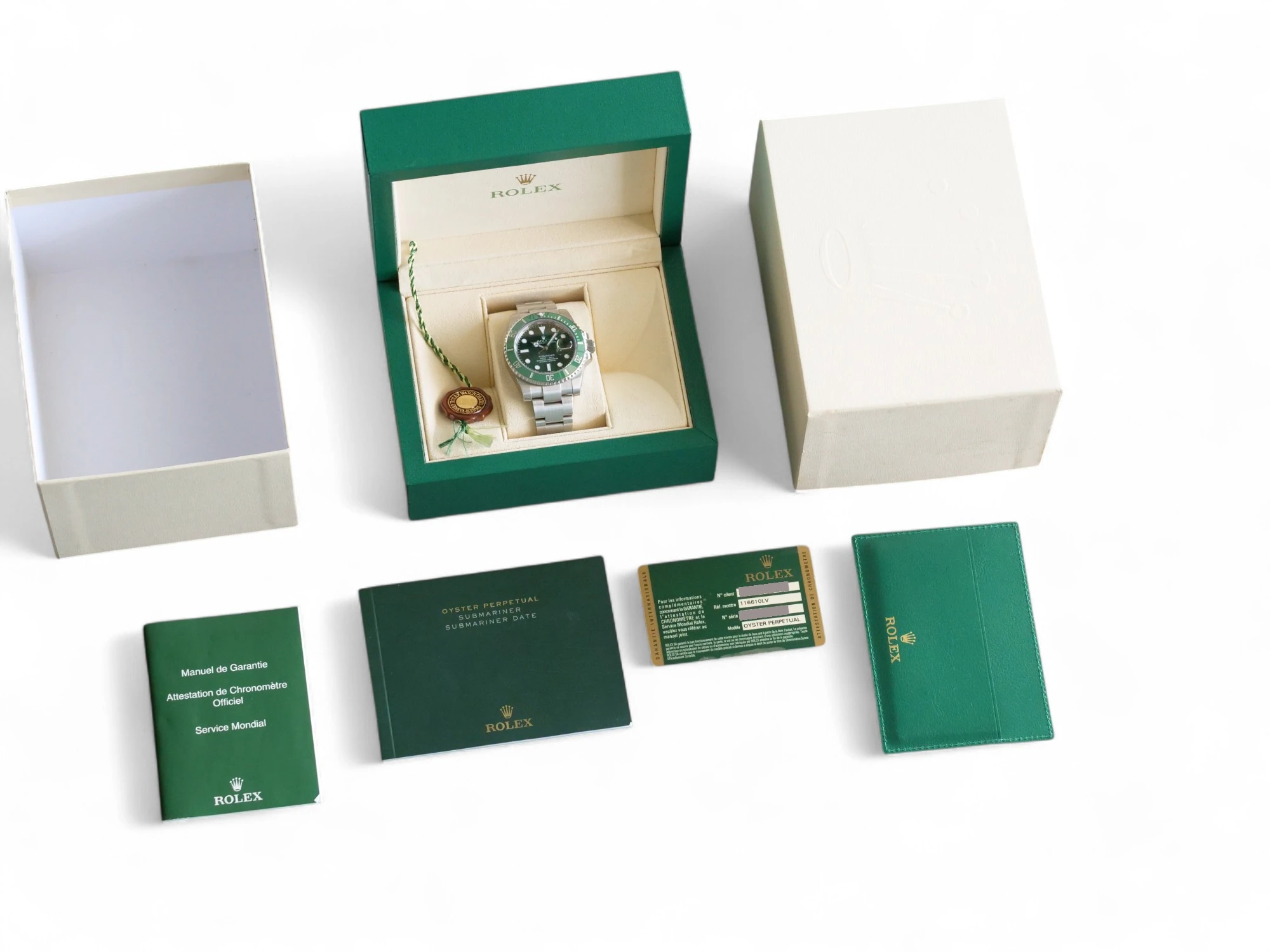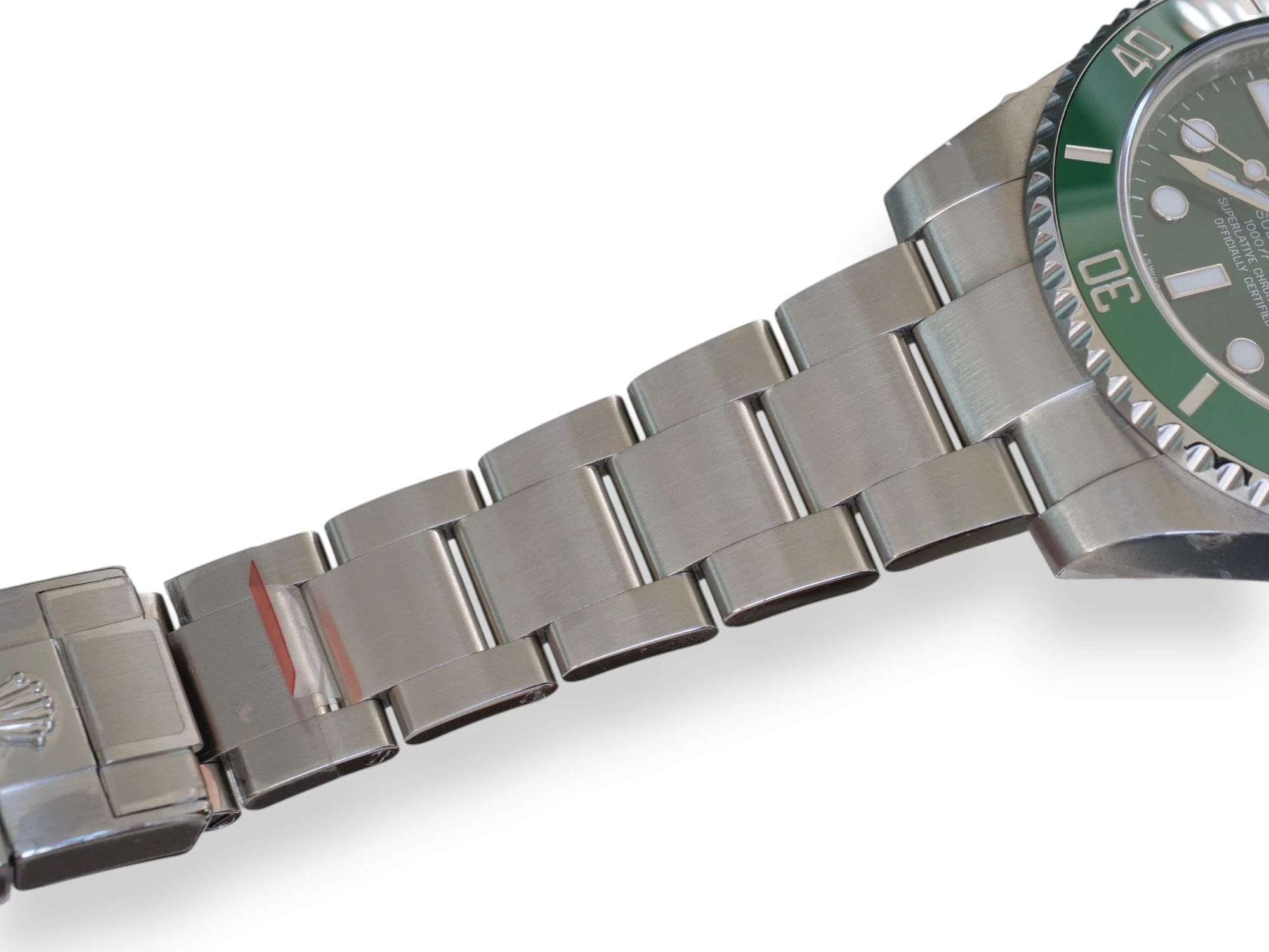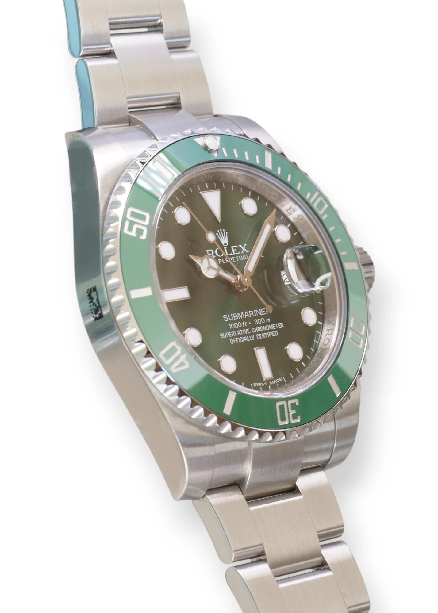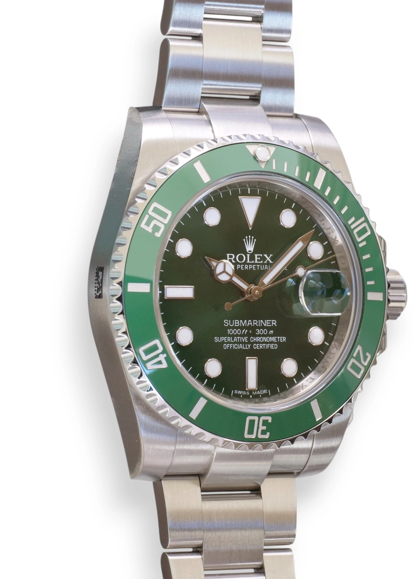 Rolex Submariner Date Hulk model 116610LV, a beautiful, long discontinued and a very collectible Rolex in a spectacular green sunburst dial, and green ceramic bezel – the only all-stainless-steel Submariner in a colored, and then a green dial ever produced in over seven decades.