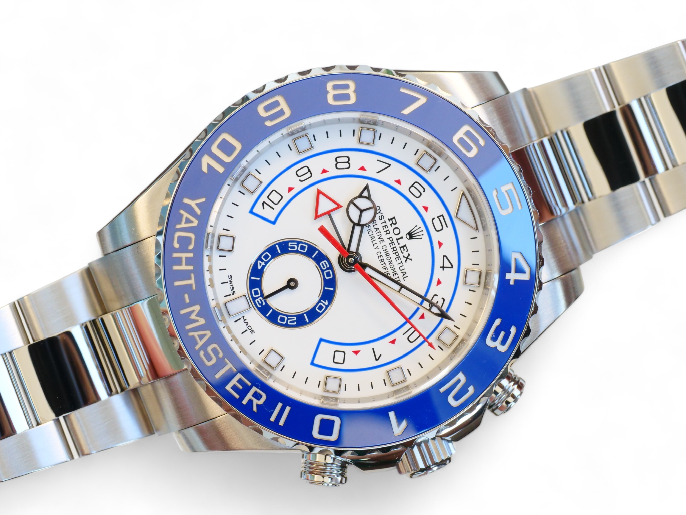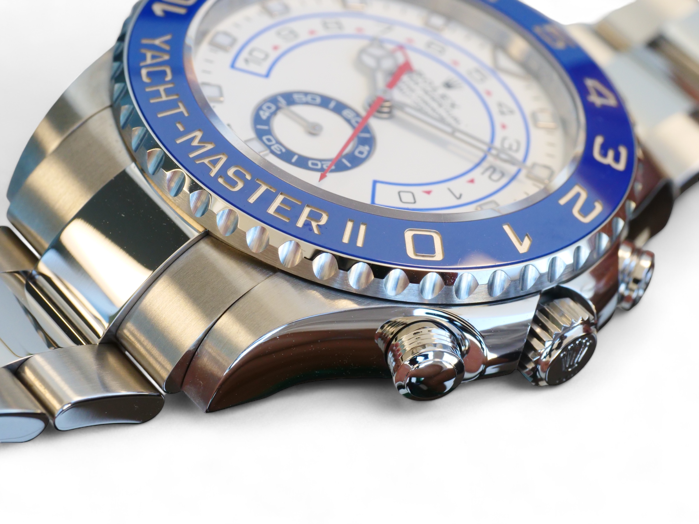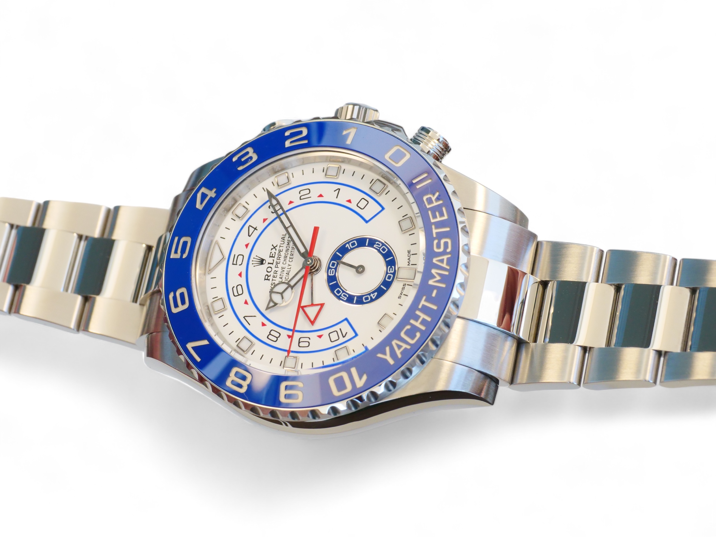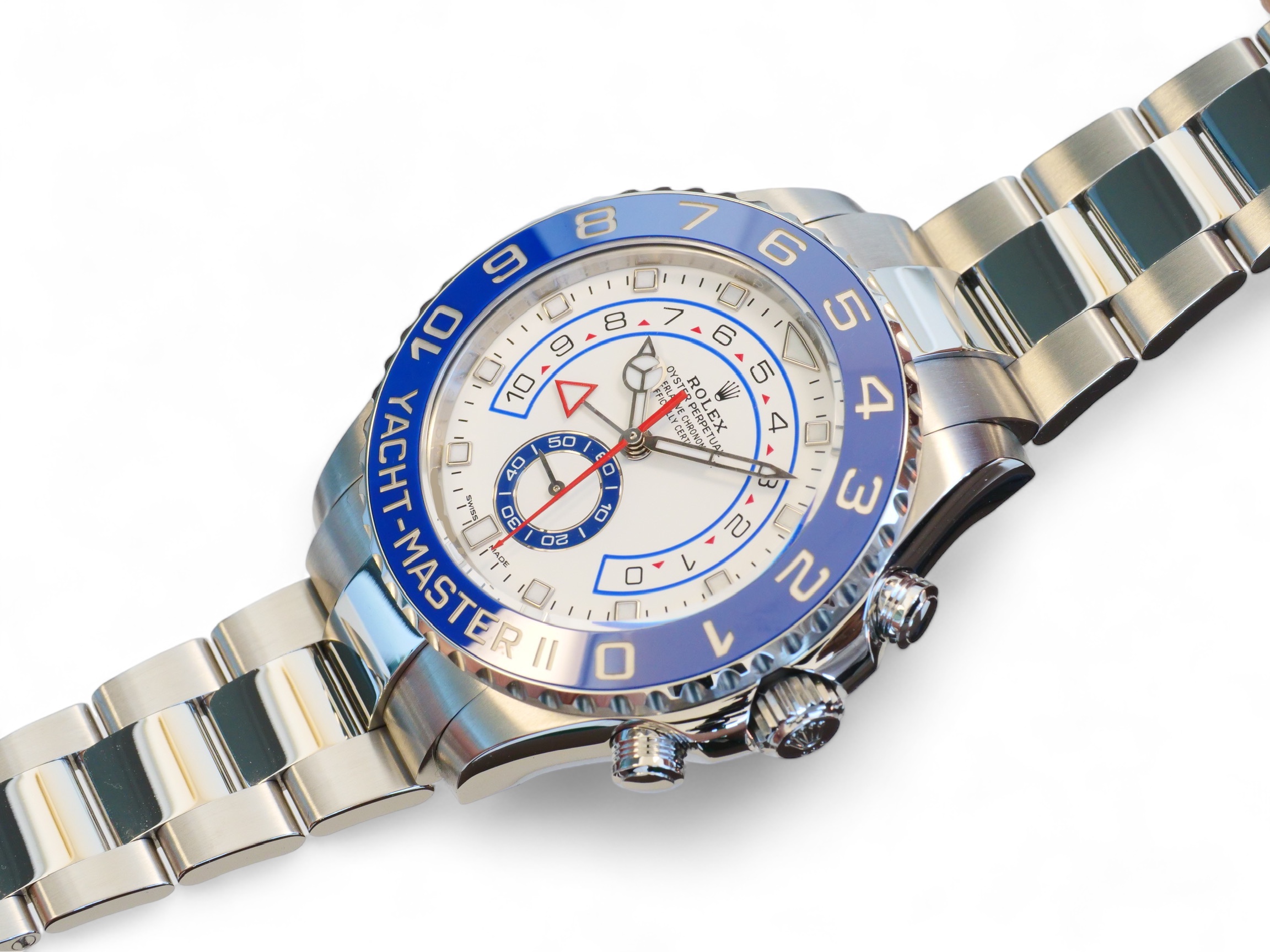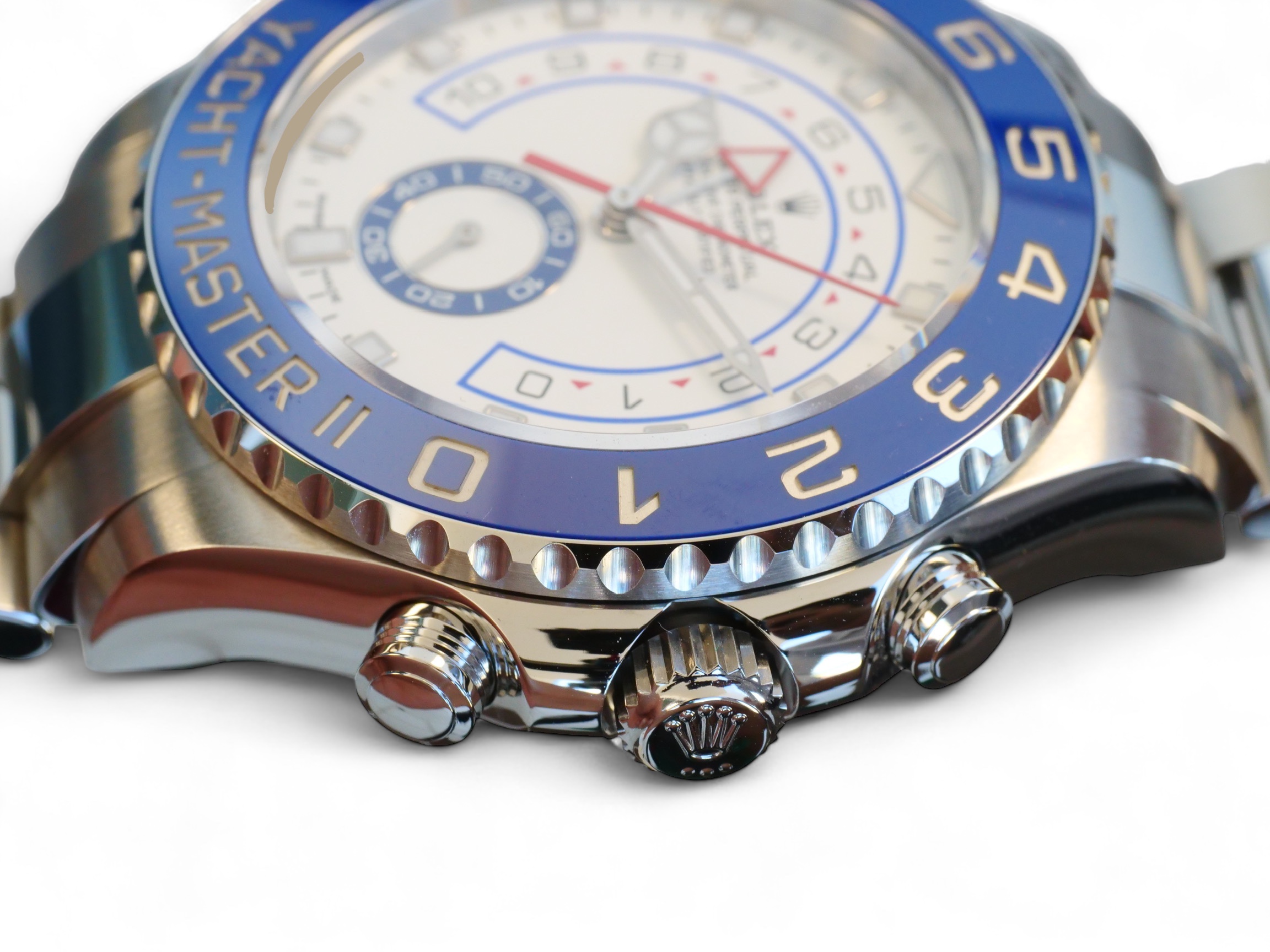On offer for sale is a highly attractive and beautiful Rolex Yachtmaster-II in Oystersteel in the latest configration with Mercedes shaped dial hands.