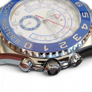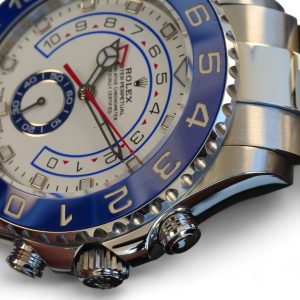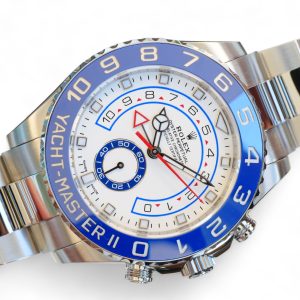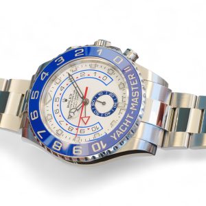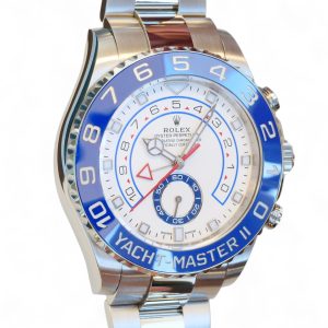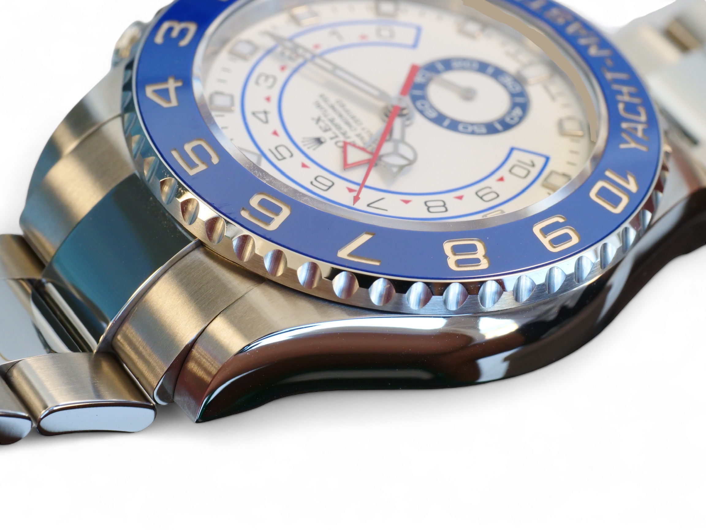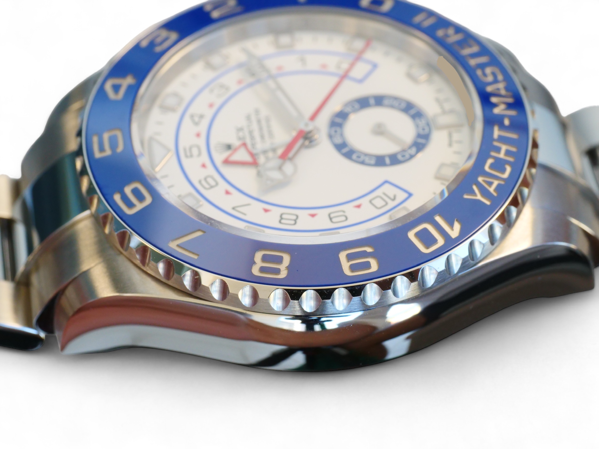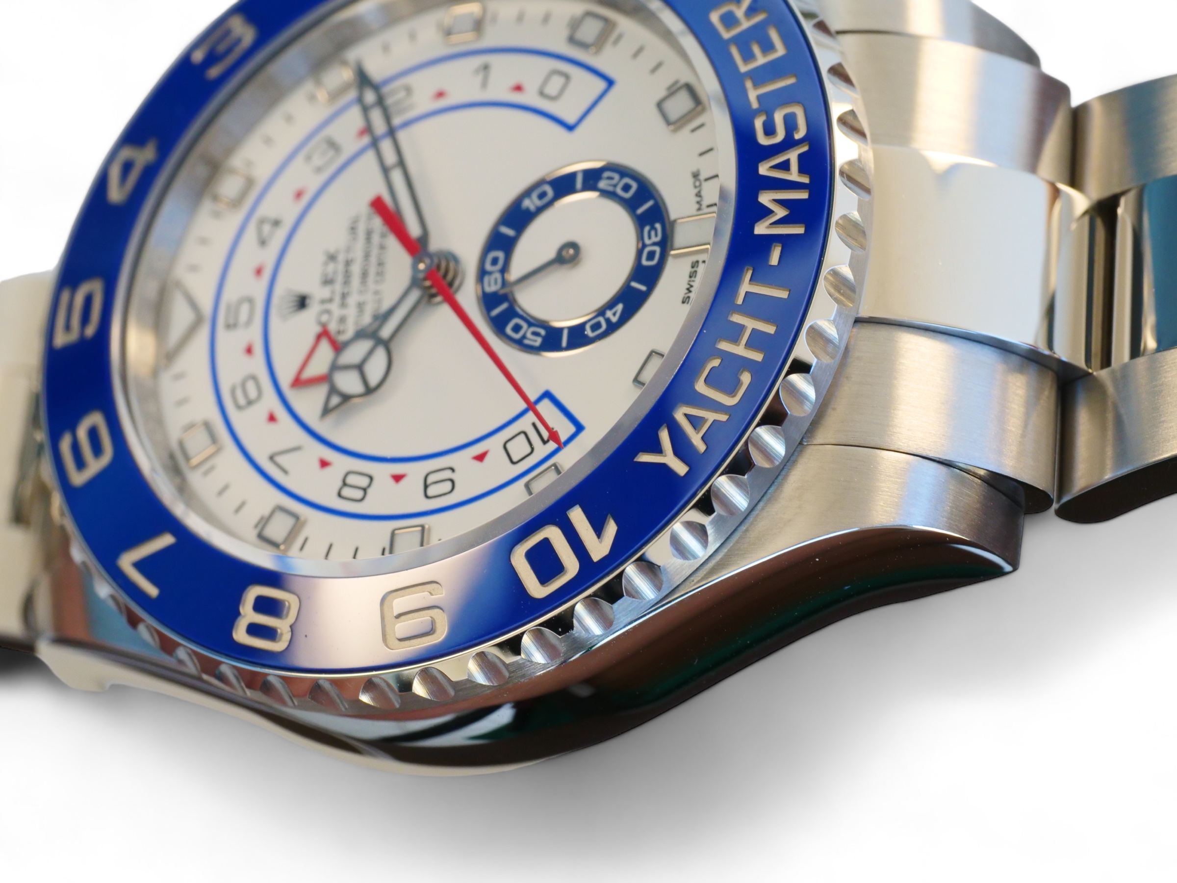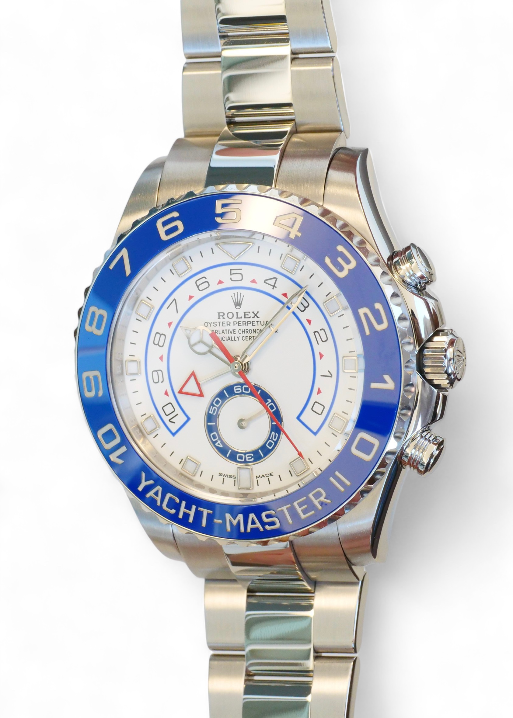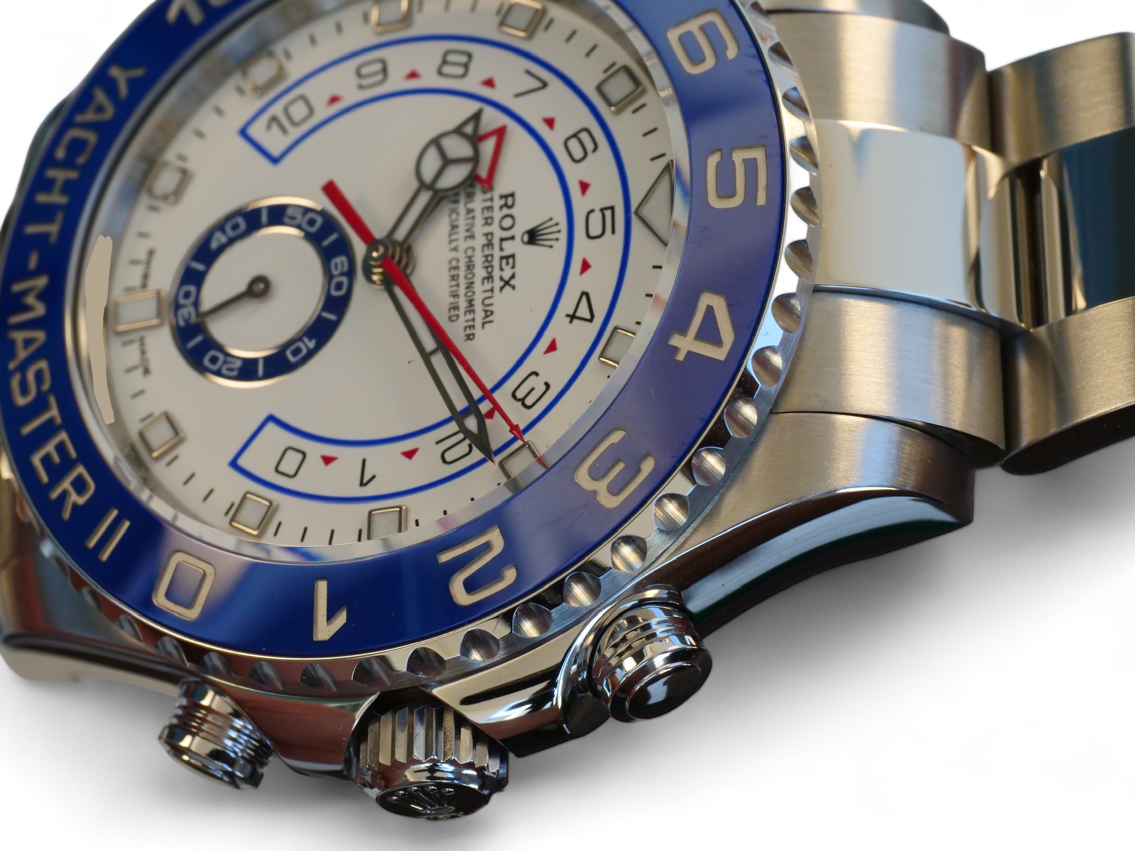 On offer for sale is a highly attractive and beautiful Rolex Yachtmaster-II in Oystersteel in the latest configration with Mercedes shaped dial hands.