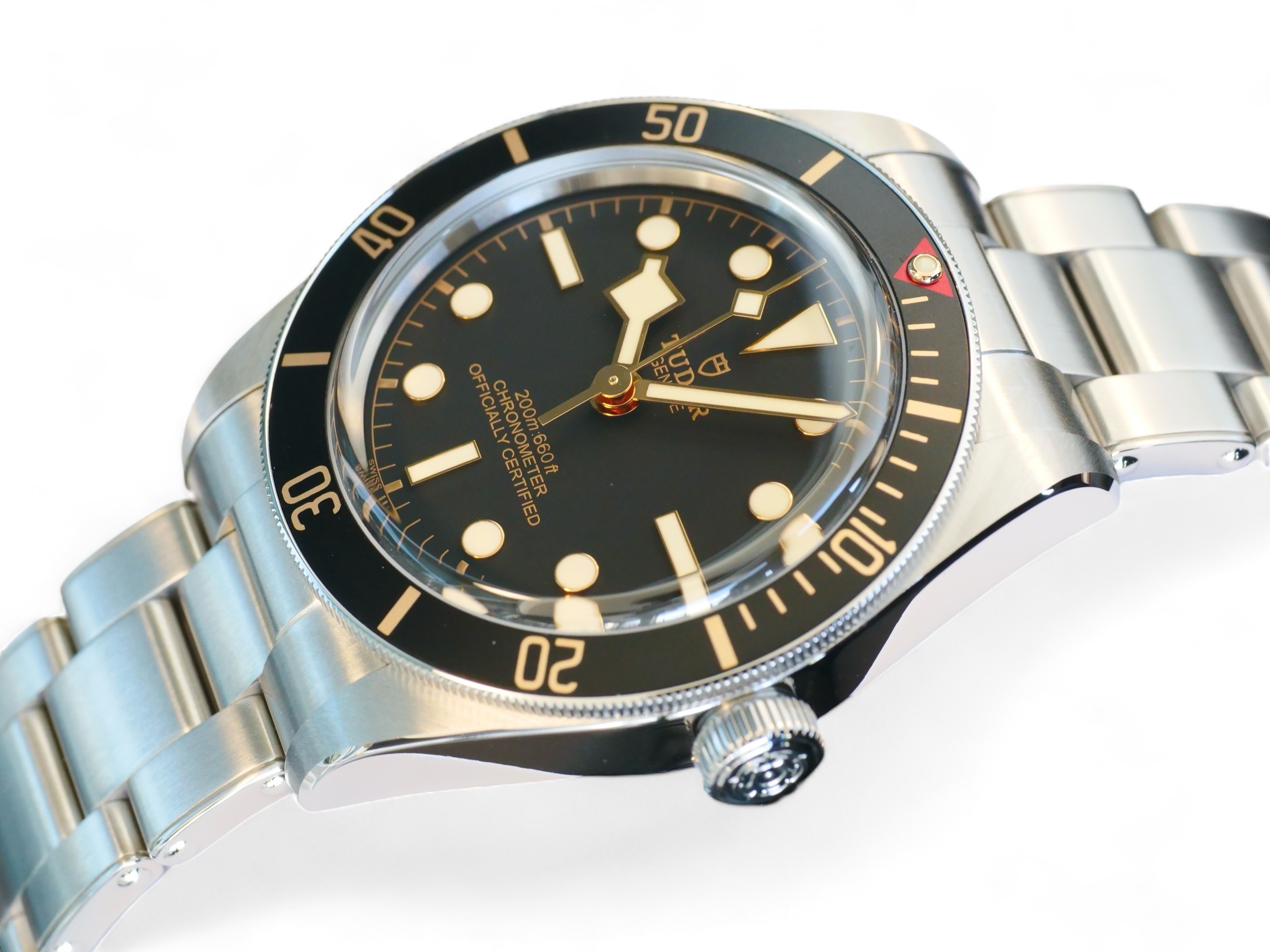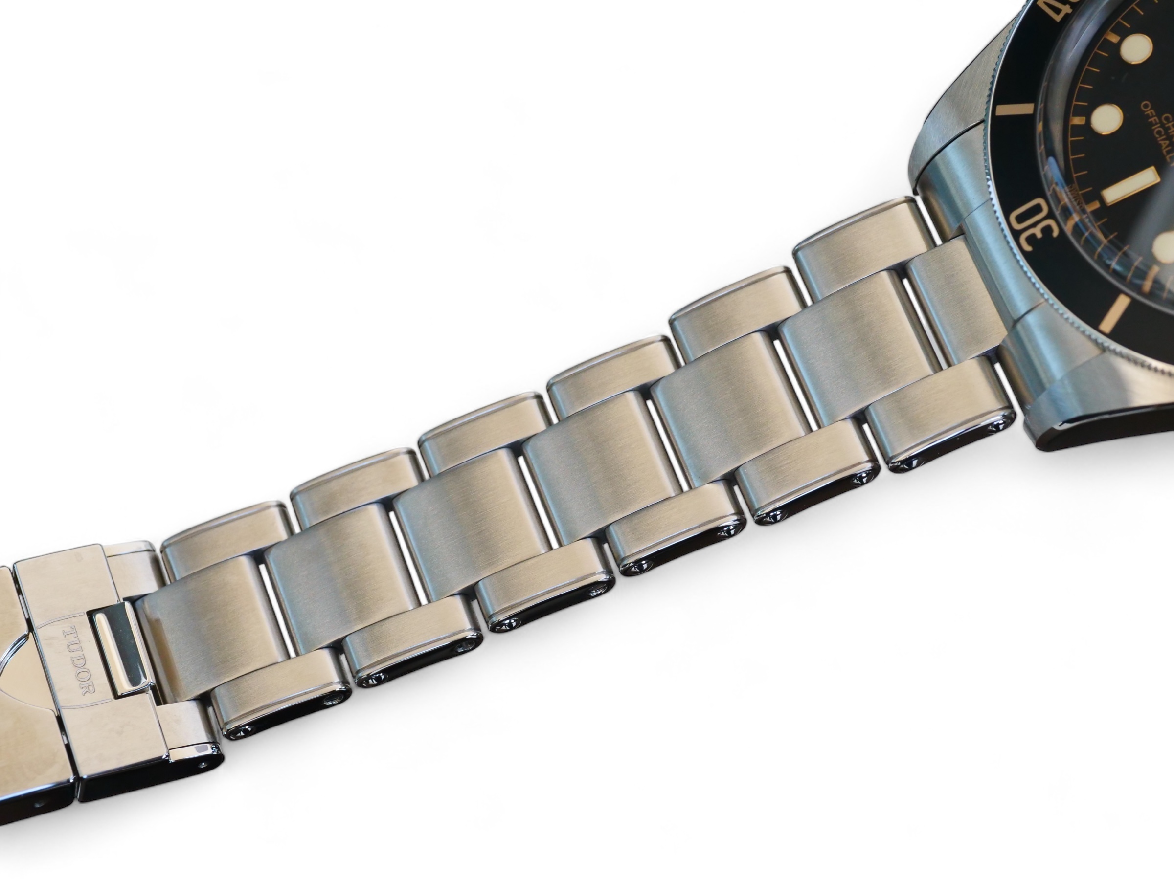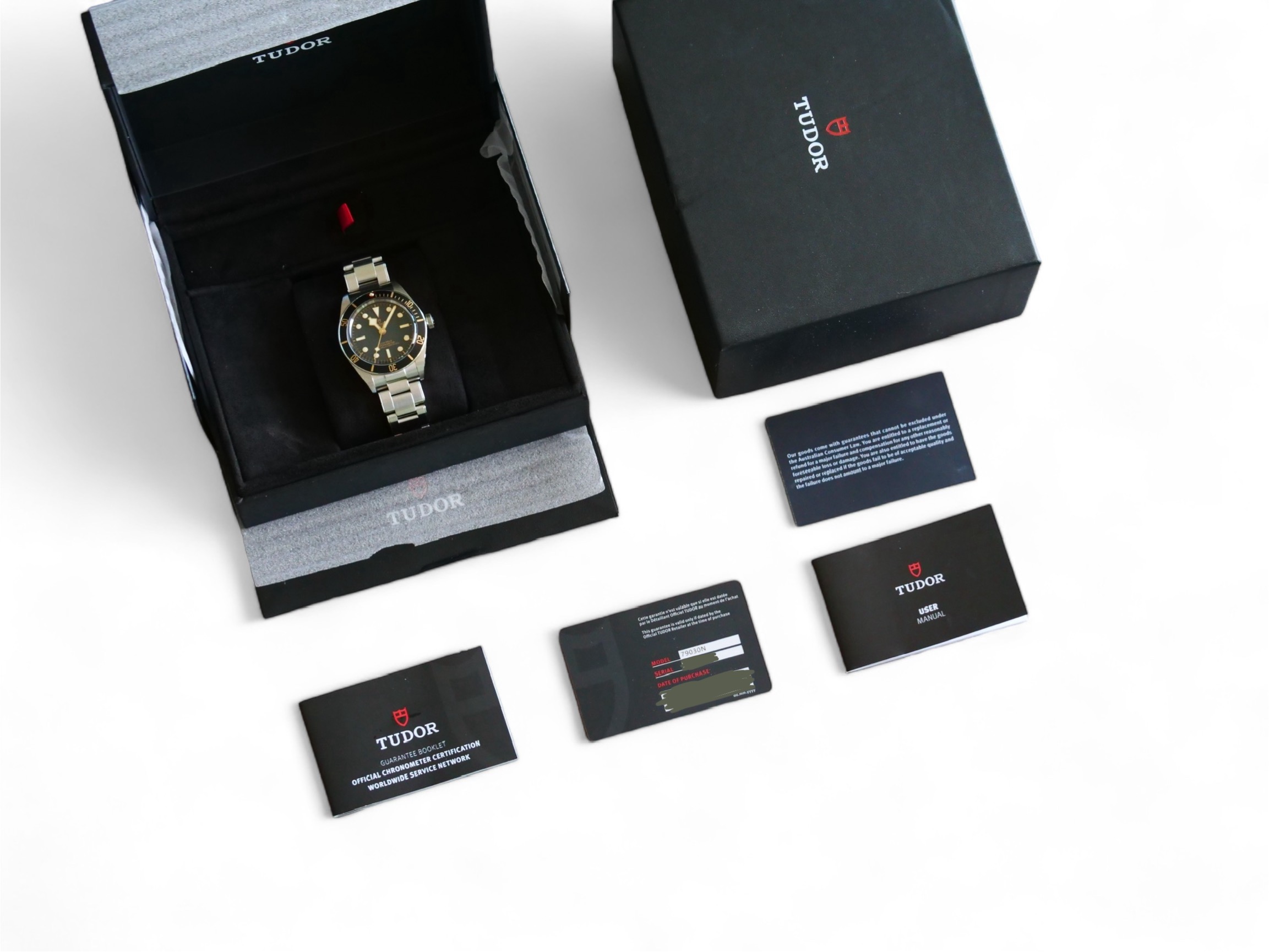Tudor Black Bay 58 in a very popular and wearable size of 39mm, stainless steel case and unidirectional rotatable bezel with 60-minute graduated disc in matt black anodised aluminium and pink gilded markings and numerals, and a matt black dial with gilt coloured lettering.