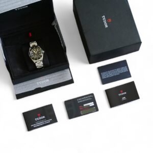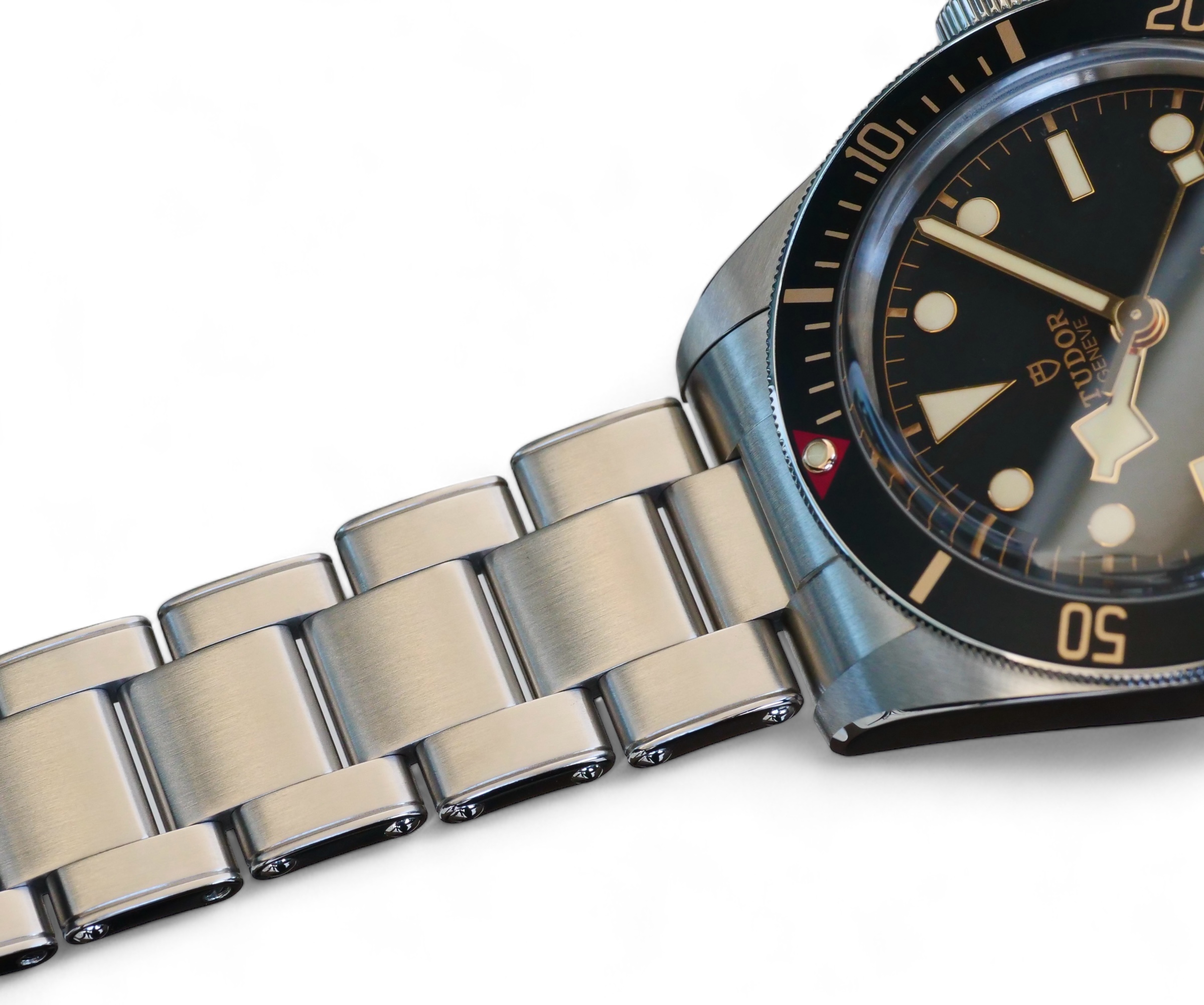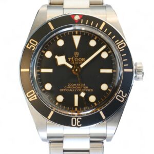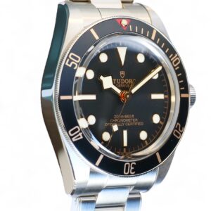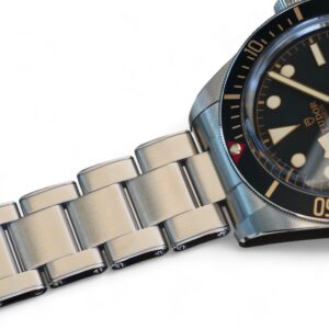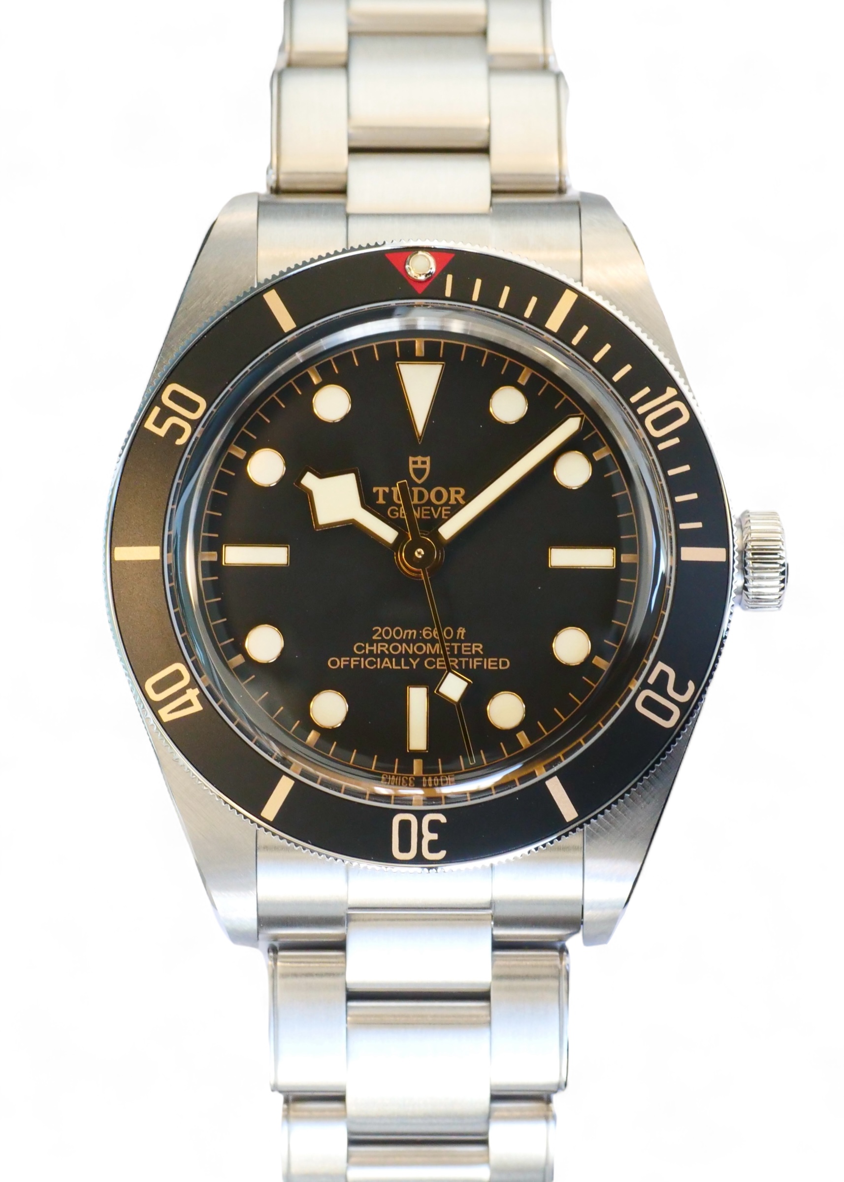 Tudor Black Bay 58 in a very popular and wearable size of 39mm, stainless steel case and unidirectional rotatable bezel with 60-minute graduated disc in matt black anodised aluminium and pink gilded markings and numerals, and a matt black dial with gilt coloured lettering.