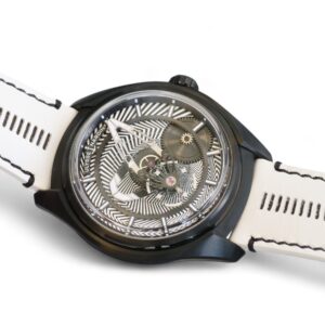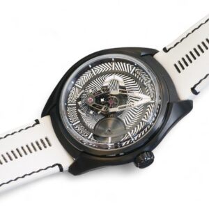 The latest Freak X Razzle Dazzle comes in a 42mm titanium case with black DLC and contrasting sandblasted and satin finishings. The dial is a movement plate decorated with razzle-dazzle motif – hour markers on the black and white stripy flange, the tip of the central bridge acting as the minute hand and the wheel indicating the hours are all treated with Super-LumiNova